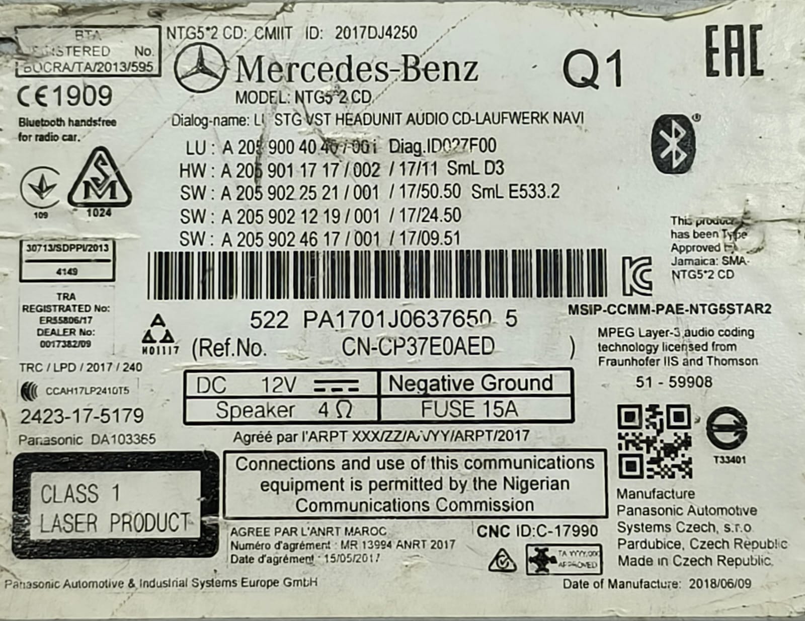 MERCEDES-BENZ C GLC C253 W205 NAVIGATION CONTROL HEADUNIT TAPE A2059004040 16-22