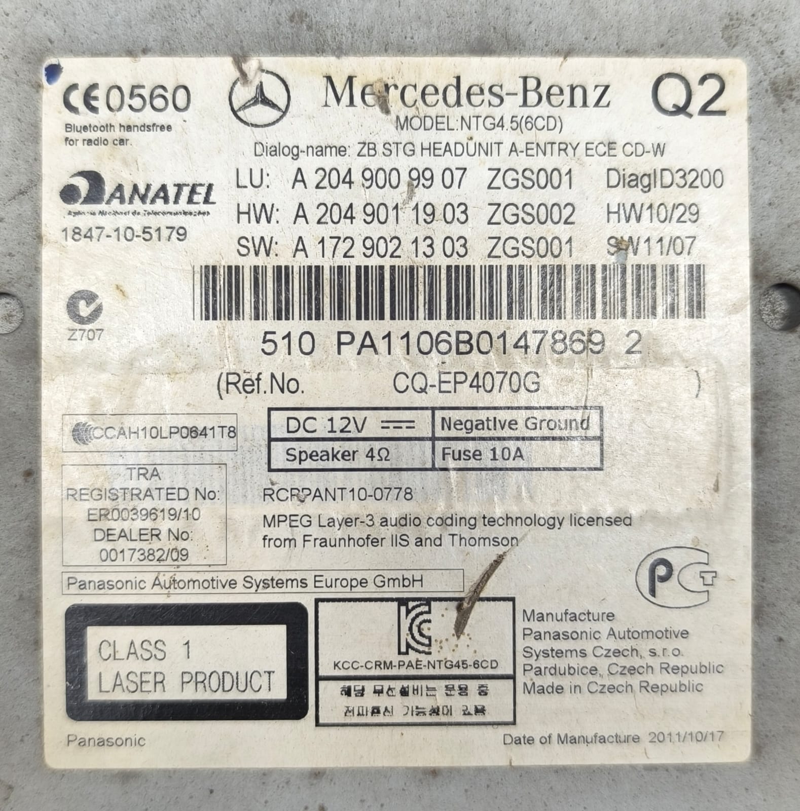MERCEDES-BNEZ C-CLASS W204 NAVIGATION CONTROL HEADUNIT TAPE A2049009907 2007-14